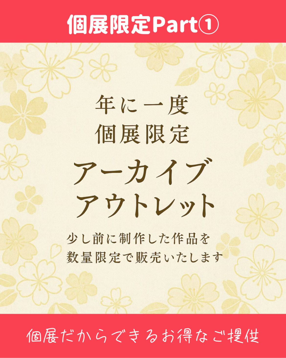 年に一度の全作品をご覧いただける個展という名の雑貨店(笑) 通常の百貨店等での出店では、ご提供できない特別価格で一部の商品をご提供させていただきます。 作った時期が少し前の商品であったり、サンプルで製作した商品、コーティ…