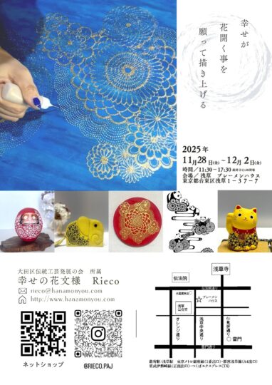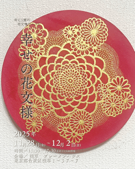 Rieco 2025年11月11日 コメントなし 今年も、浅草で開催させて頂きます! 2025年11月28日(金)〜12月2日(火) 税込3,000円以上のお買い上げで、プレゼントをご用意しようと思っています。これから、試作して!出来上がり次第ご紹介します。 お楽しみに♡ Rieco Tweet ← みんなの幸せの花文様展 個展だけの「アーカイブアウトレット」 →